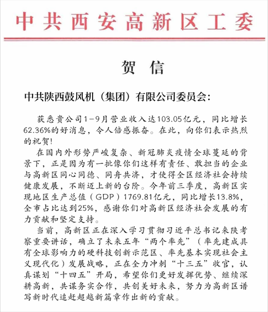 近日陕鼓收到的来自中共西安高新区工委发来的一封贺信。信中对陕鼓1-9月营业收入同比增长62.36%表示祝贺,对陕鼓在疫情蔓延背景下,对高新区经济社会发展有力的贡献和支持表示感谢。