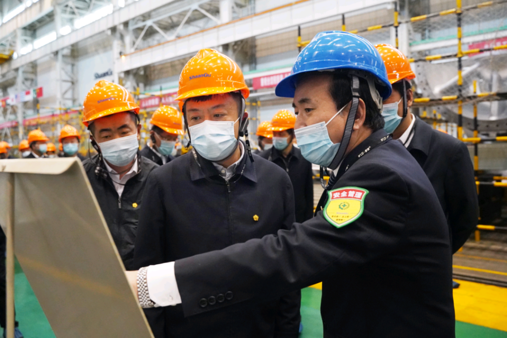 在陕鼓总装车间,李宏安董事长对陕鼓核心产品在技术创新、应用领域等方面向杜小刚书记一行作了介绍。