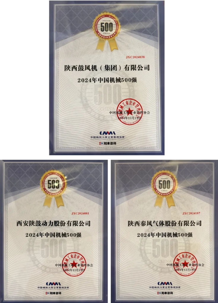 在“中国机械500强”榜单中,陕鼓集团跃居第38位,较2023年提升3位;陕鼓动力位列500强第81位;秦风气体位列500强第187位。