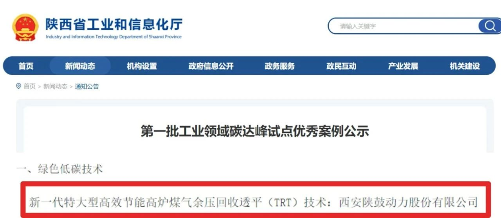 近日,陕西省工业和信息化厅公示了《第一批工业领域碳达峰试点优秀案例名单》,陕鼓动力“新一代特大型高效节能高炉煤气余压回收透平(TRT)技术”成功入选,成为全省首批工业领域碳达峰试点优秀案例之一。这一荣誉不仅是对陕鼓在绿色低碳领域技术创新的高度认可,更是对陕鼓践行“双碳”战略、推动行业绿色转型的充分肯定。